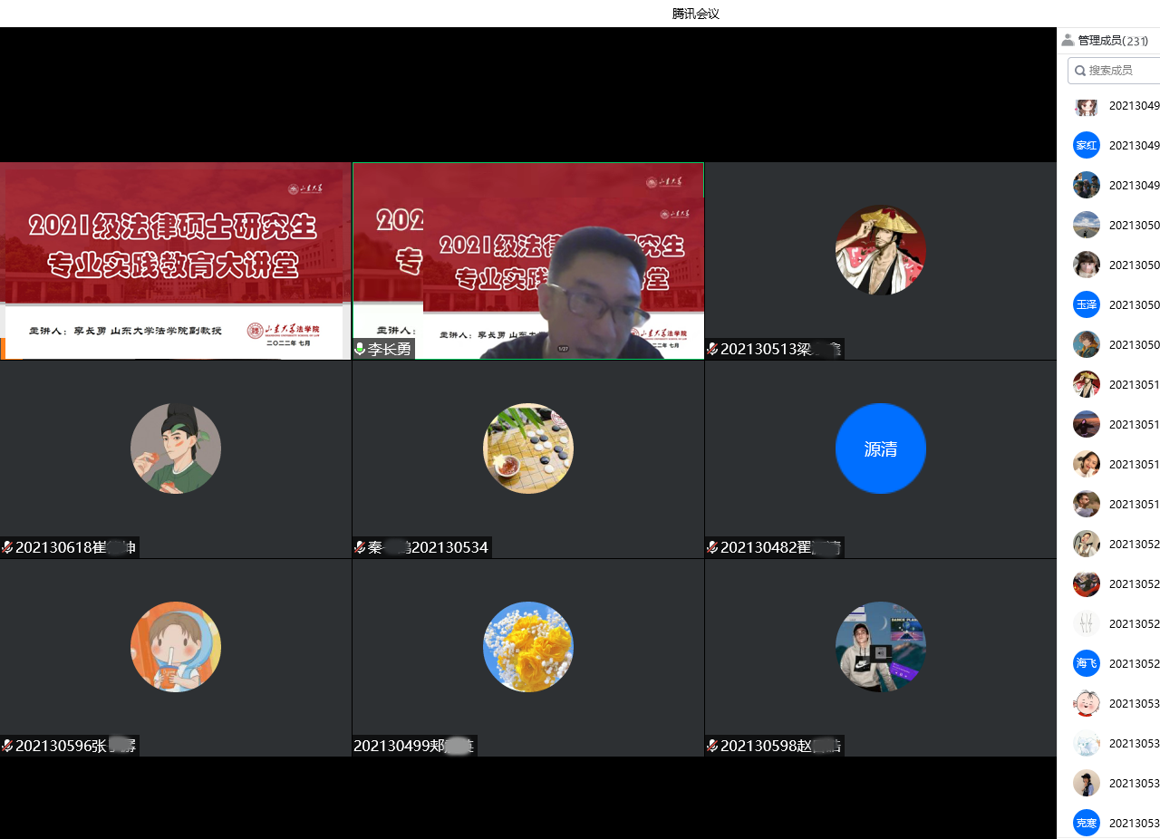 按照专业学位硕士研究生培养进程,2021级法律硕士研究生专业实践将于第二学年多样化、分段式展开。为强化同学们在专业实习期间的安全和保密意识,7月11日,学院组织法律硕士研究生专业实践线上教育活动,本次线上讲堂由研究生办公室张晓敏老师主持,宪法行政法研究所李长勇副教授主讲,2021级全体法律硕士研究生和部分法学硕士研究生参加。