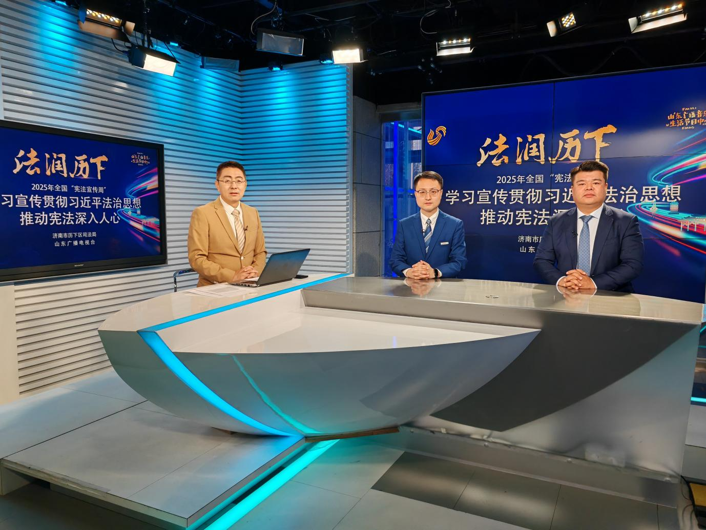12月6日下午,历下区司法局联合山东广播电视台制作的2025年“宪法宣传周”主题活动《法润历下》普法直播节目第167期顺利播出。本期节目的主题为“学习贯彻习近平法治思想推动宪法深入人心”,法学院助理研究员陈伟博士担任主讲嘉宾,山东圣义(济南自贸区)律师事务所执行主任刘诚发担任与谈嘉宾,山东广播电视台谭超杰担任本期节目的主持人。