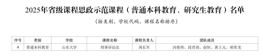 近日,山东省高等学校课程思政研究中心公布了2025年山东省课程思政示范课程,法学院《刑事诉讼法》入选普通本科教育课程思政示范课程。