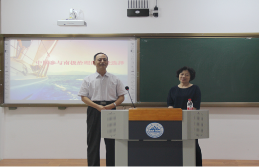 在讲座开始之前,姜教授简要介绍了主讲人刘惠荣教授并对其表示了欢迎,随后讲座正式开始。首先,刘教授从“地理意义上的南极”与“法律意义上的南极”两个方面对南极的总体情况进行了介绍。地理意义上的南极包括南极大陆及其周围岛屿,是世界上发现最晚的大陆;法律意义上的南极一般是指《南极条约》所规定的南纬60°以南的大陆。在介绍南极基本情况的过程中,刘教授向现场观众展示了其参与南极科考时的部分照片。