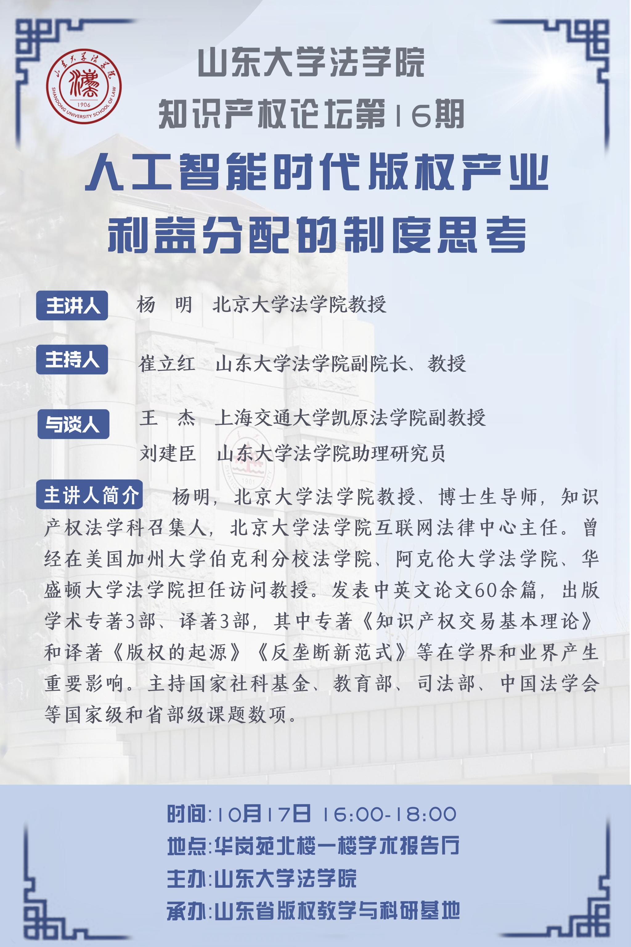 讲座预告 | 山东大学法学院知识产权论坛第16期:人工智能时代版权产业利益分配的制度思考