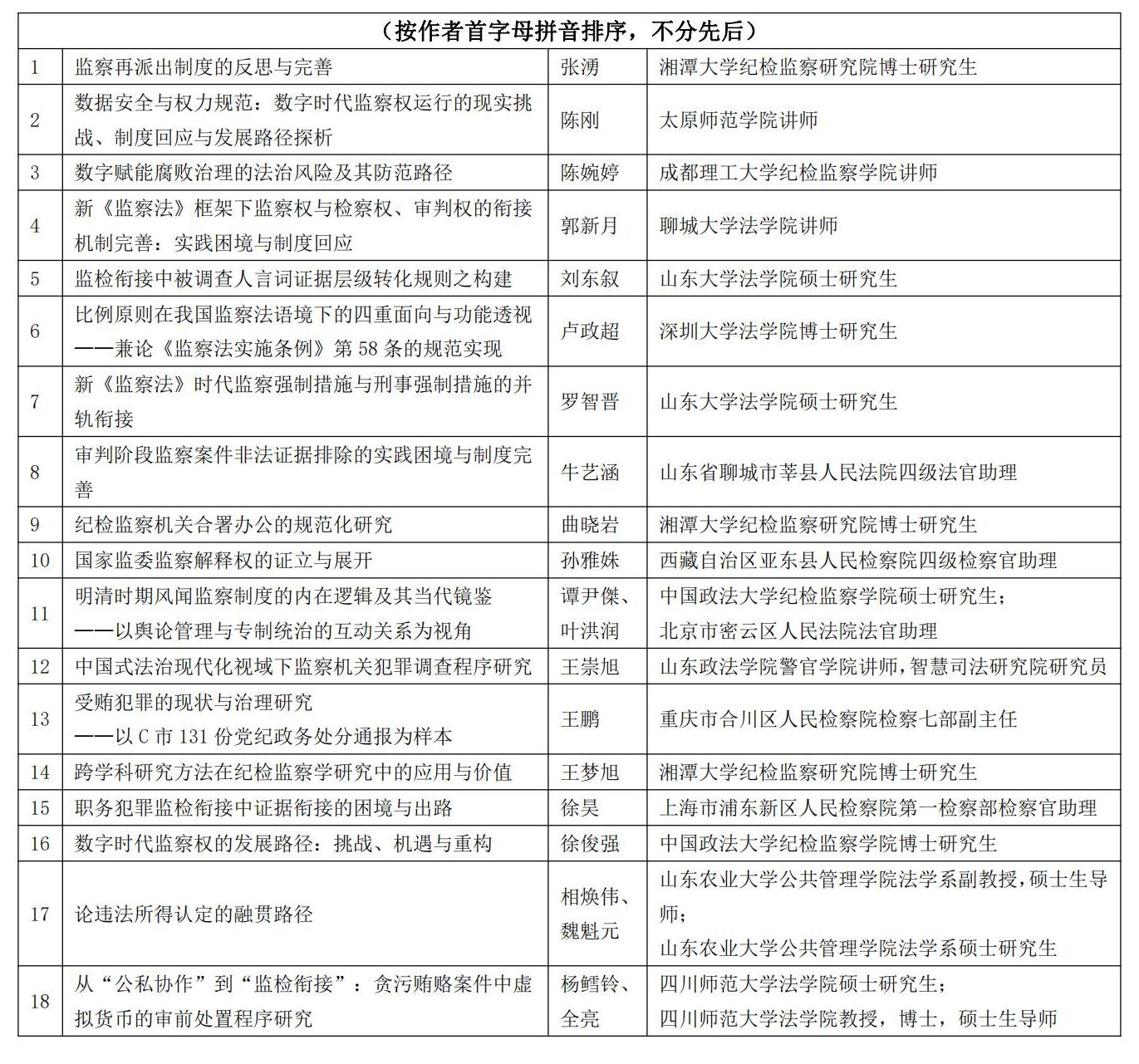 截至2025年10月30日,“中国特色监察制度的法理基础与实践逻辑”研讨会暨山东省法学会监察法学研究会2025年学术年会主题征文活动共收到论文80篇。经会务组组织专家进行评审,共评选出优秀论文33篇。其中,一等奖5篇、二等奖10篇、三等奖18篇。现将优秀论文获奖建议名单予以公示,公示期为3个工作日。如有异议,请及时向会务组反映,联系邮箱:dahan92@163.com。