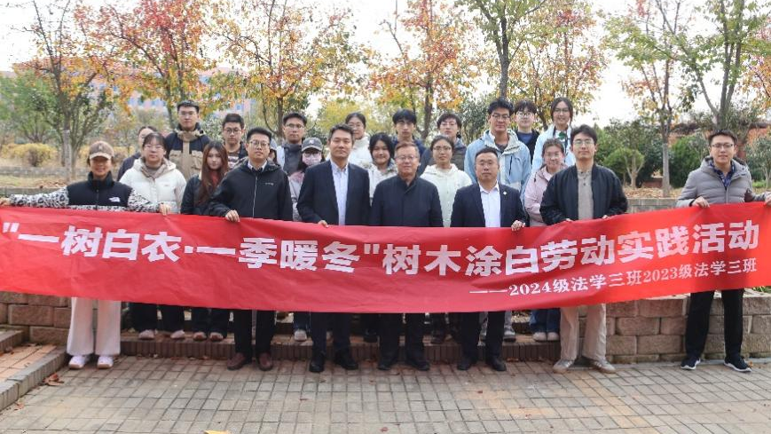 为弘扬新时代劳动精神,引导班级同学在劳动实践中磨砺意志、提升素养、涵养品德,11月6日,2024级法学三班、2023级法学三班在青岛校区校友林开展“一树白衣·一季暖冬”劳动实践活动。后勤管理处副处长王奉合、法学院党委副书记宋继斌参加活动,与同学们一起在绿化带内开展树木涂白作业,为树木做好防寒越冬的准备工作。