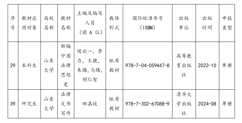 近日,山东省教材委员会办公室公布第三批山东省普通高等教育一流教材名单,法学院侯欣一教授主编的《新编中国法律思想史》(本科生)和田荔枝教授主编的《法律文书写作》(研究生)入选。