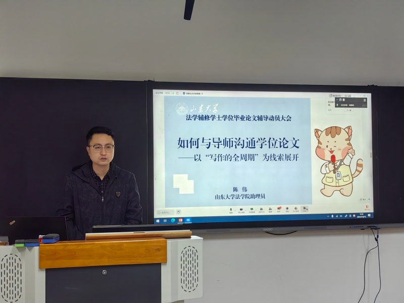 2025年10月12日上午,在洪家楼校区逸夫法学楼302教室举行了2026届辅修双学位毕业论文辅导暨动员大会。陈伟老师作写作辅导,班主任陈静主持会议,2022级法学辅修学士学位班同学通过线上及线下的方式参会。