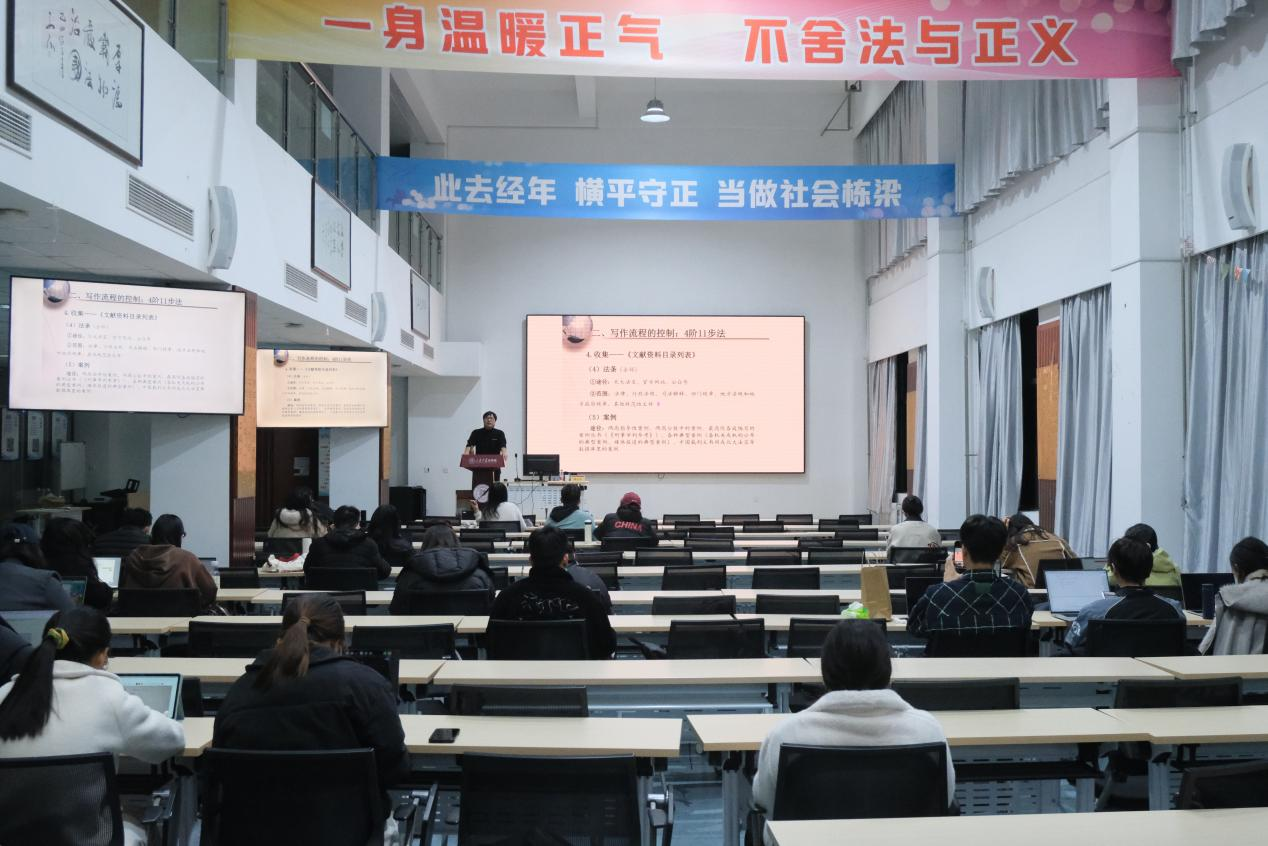 11月11日,“法聿”硕士学位论文写作指导系列活动之法理学方向讲座于华岗苑举办。本期讲座由学院法理法史研究所助理研究员周文章担任主讲嘉宾,2025级硕士研究生蔺梓涵主持,四十余名学生参加讲座。