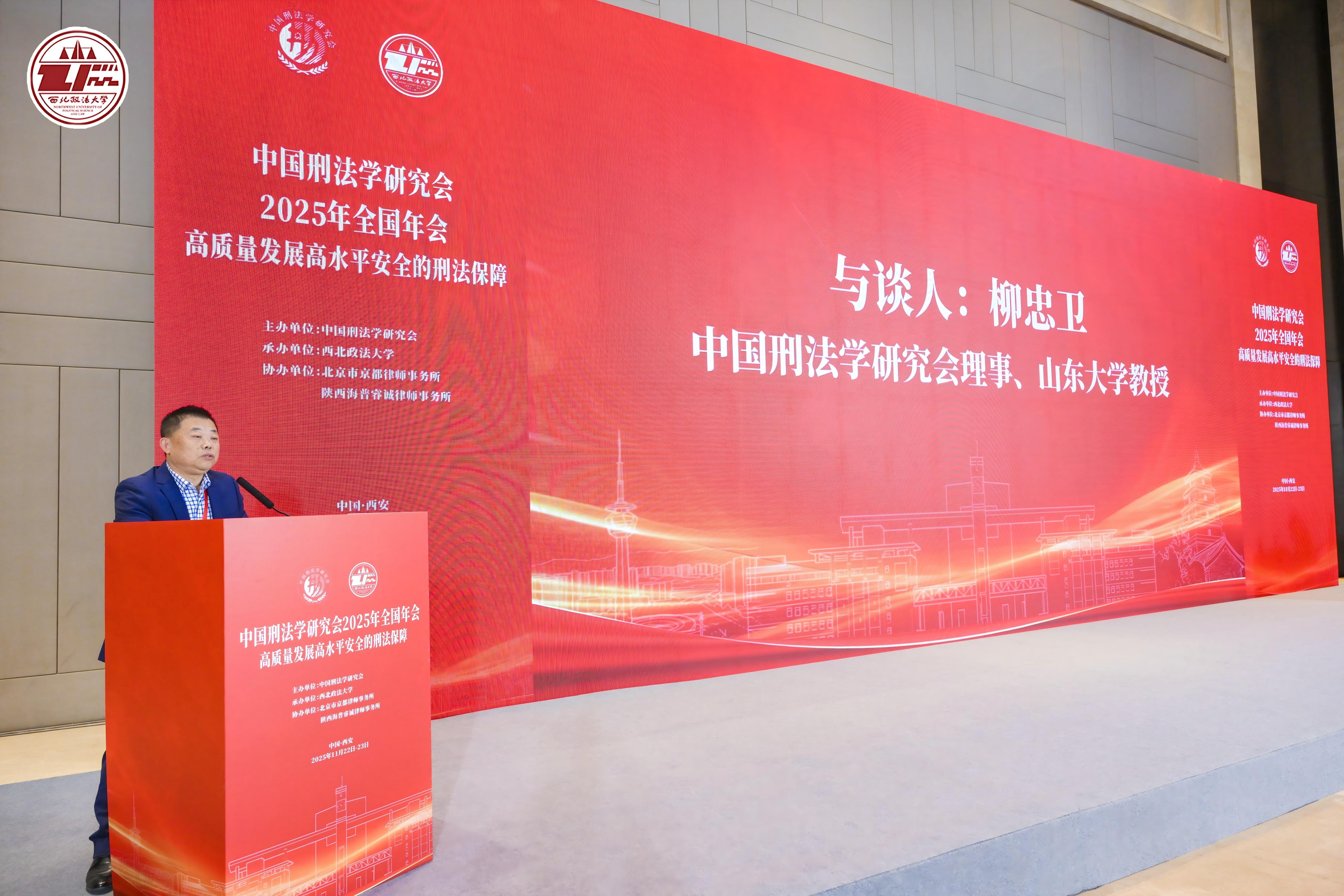 11月22日至23日,中国刑法学研究会2025年全国年会在西安召开。本届年会由中国刑法学研究会主办,西北政法大学承办。会议深入学习贯彻习近平法治思想,学习贯彻党的二十届四中全会精神和中央全面依法治国工作会议精神,以“高质量发展、高水平安全的刑法保障”为主题,围绕我国刑法学发展中的重大理论和实践问题展开深入研讨。来自国内刑事法学界的专家学者及实务界代表等近五百人出席本届年会。我院柳忠卫教授、江海洋副教授、李志恒老师受邀参加本次年会。