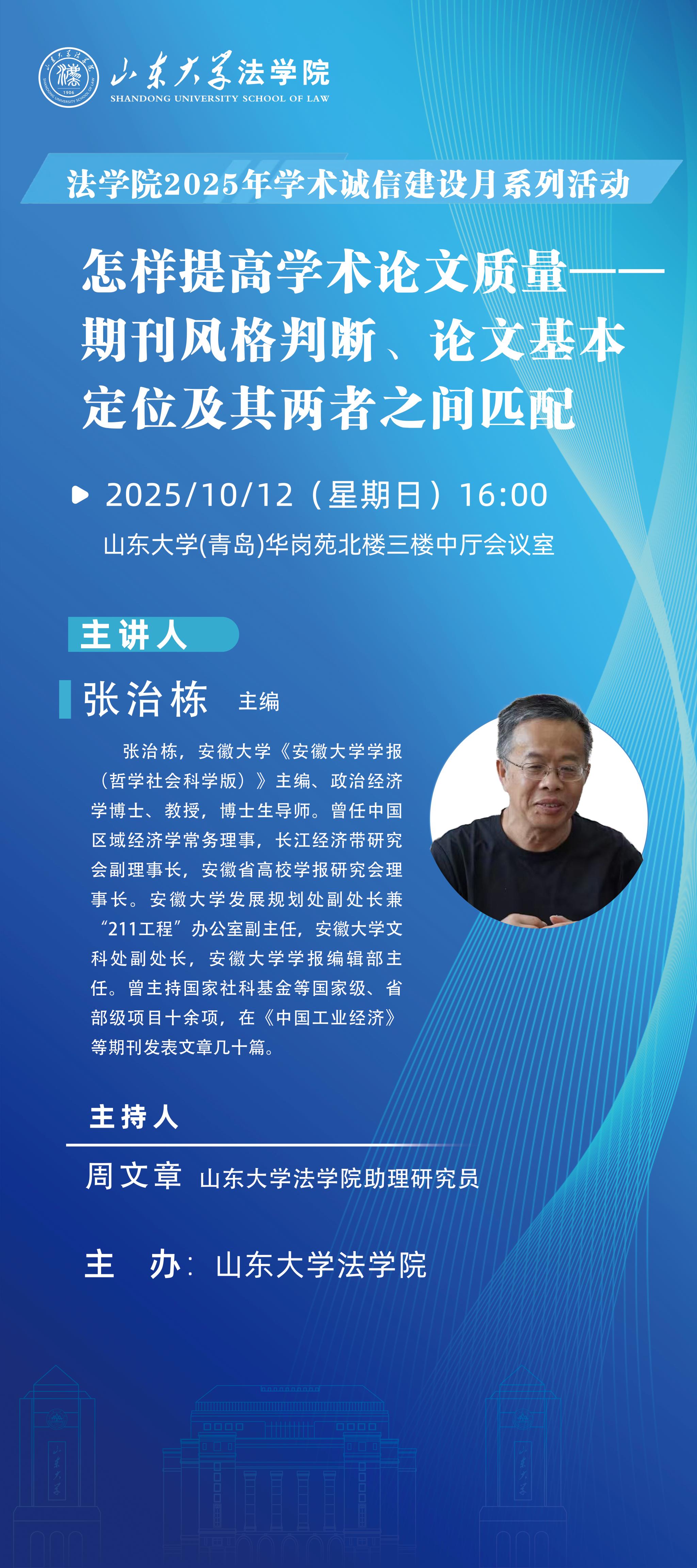 讲座预告 | 法学院2025年学术诚信建设月系列活动:怎样提高学术论文质量--期刊风格判断、论文基本定位及其两者之间匹配