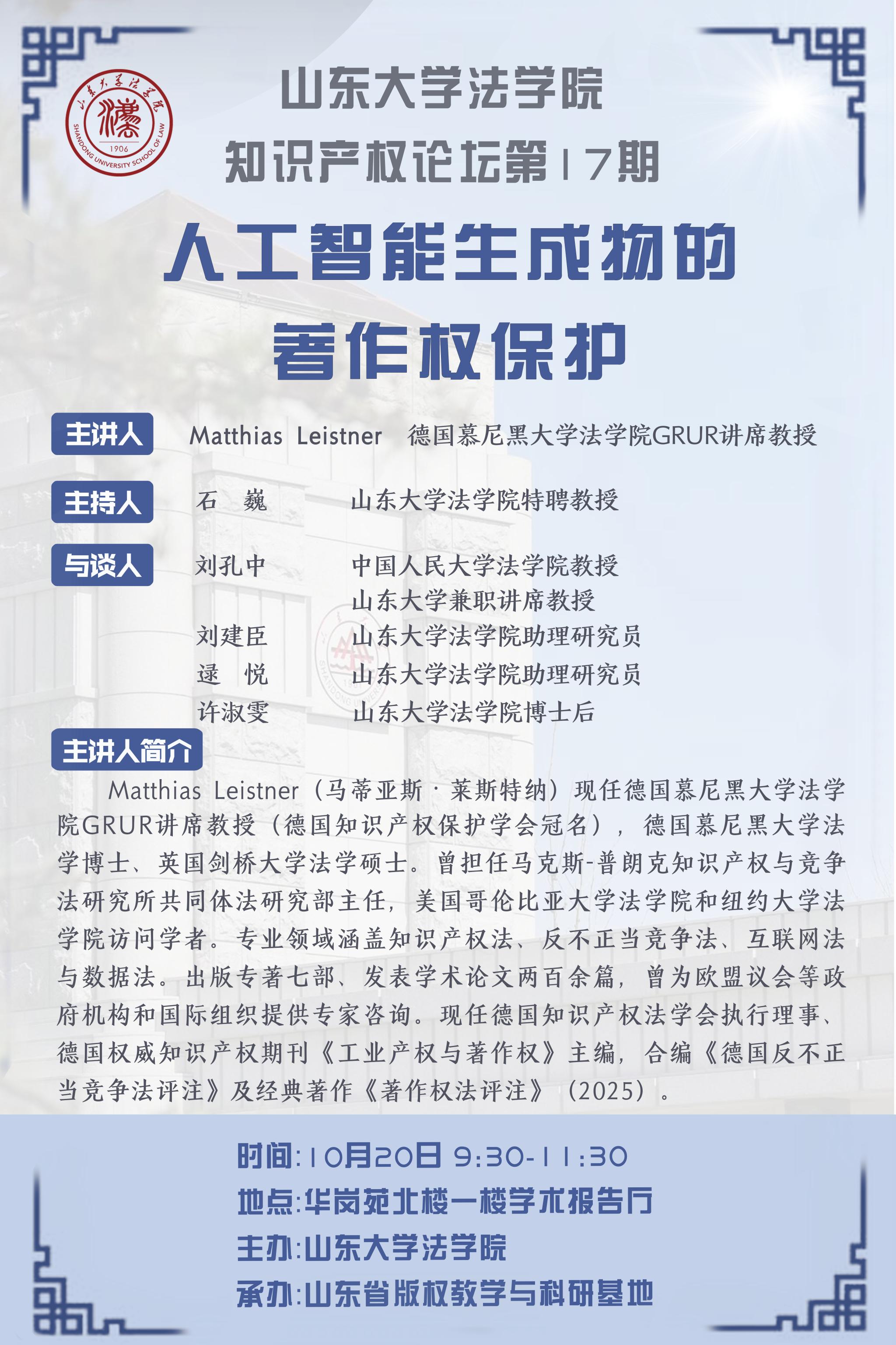 讲座预告 | 山东大学法学院知识产权论坛第17期:人工智能生成物的著作权保护