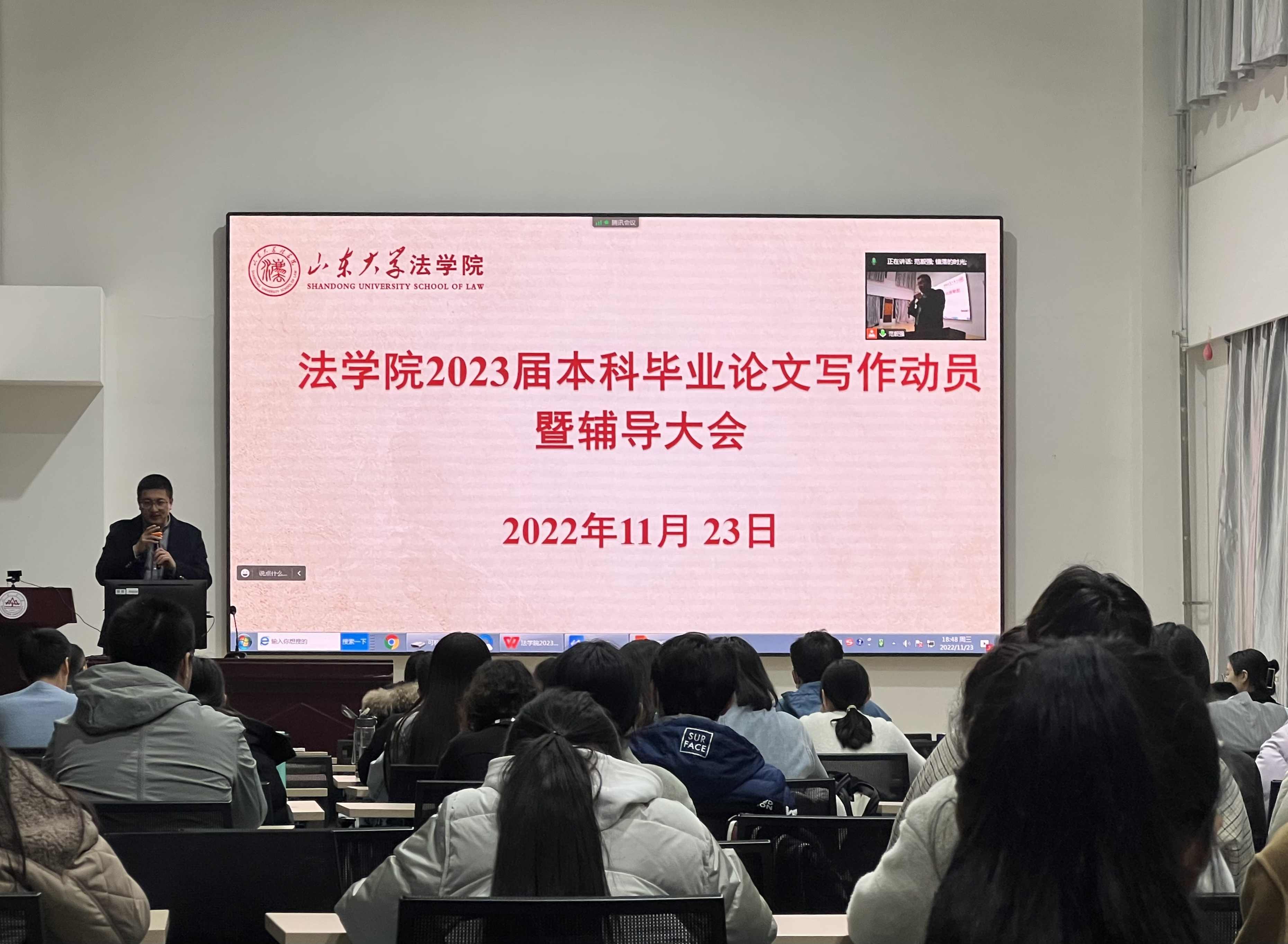 11月23日,法学院2023届本科毕业论文写作动员暨辅导大会在华岗苑北楼举行,法学2019级和法学与英语双学位班2018级毕业班学生共170余人通过线上、线下两种形式参加会议。副院长冯俊伟教授作动员指导,副研究员宋保振作写作辅导报告,教务秘书范毅强主持会议。